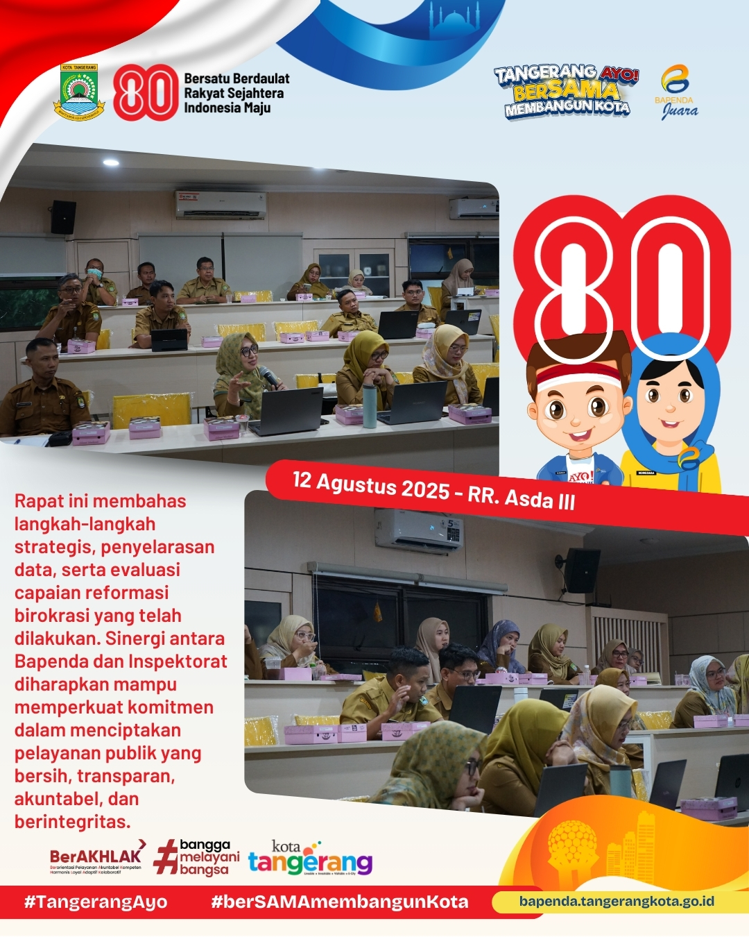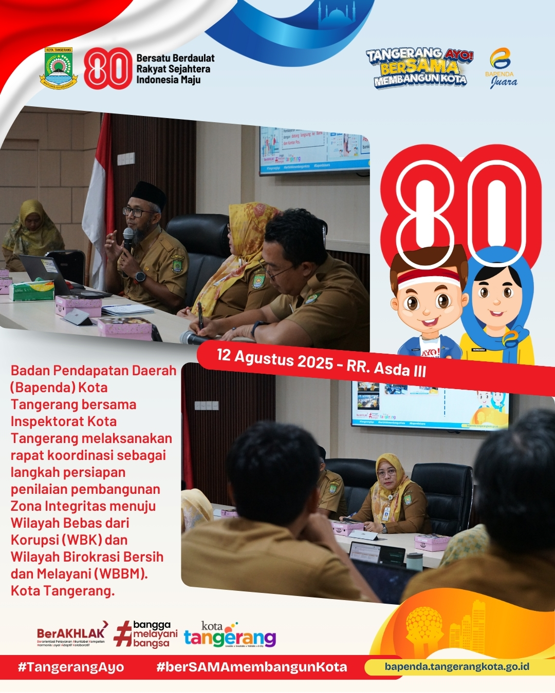 Badan Pendapatan Daerah (Bapenda) Kota Tangerang melaksanakan rapat koordinasi bersama Inspektorat Kota Tangerang sebagai bagian dari persiapan penilaian pembangunan Zona Integritas menuju Wilayah Bebas dari Korupsi (WBK) dan Wilayah Birokrasi Bersih dan Melayani (WBBM).