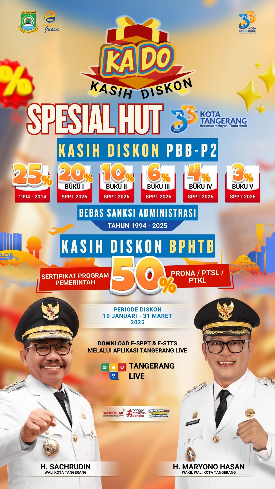 Dalam rangka menyambut Hari Ulang Tahun (HUT) ke-33 Kota Tangerang, Pemerintah Kota Tangerang melalui Badan Pendapatan Daerah (Bapenda) menghadirkan program relaksasi Pajak Bumi dan Bangunan Perdesaan dan Perkotaan (PBB-P2) serta Bea Perolehan Hak atas Tanah dan Bangunan (BPHTB) sebagai KADO spesial untuk masyarakat. Program relaksasi pajak ini berlaku mulai 19 Januari hingga 31 Maret 2026.