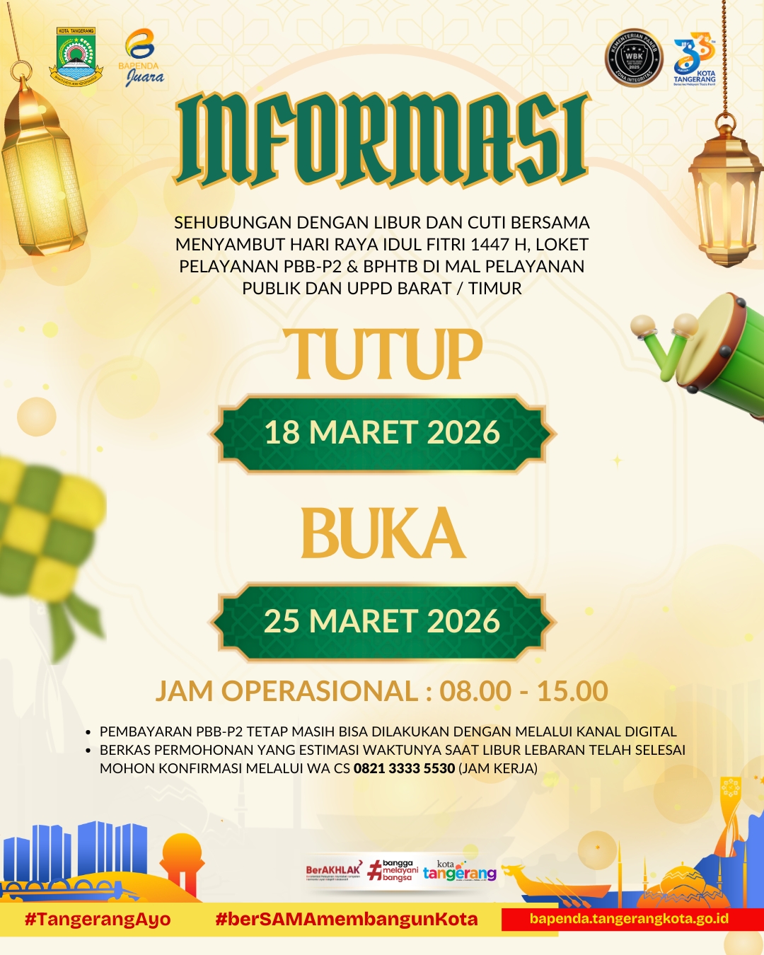Halo Sobat Pajak Kota Tangerang! Sehubungan dengan Libur Nasional & Cuti Bersama menyambut Hari Raya Nyepi dan Hari Raya Idul Fitri 1447H, pelayanan tatap muka di loket PBB dan BPHTB Bapenda Kota Tangerang akan TUTUP pada: